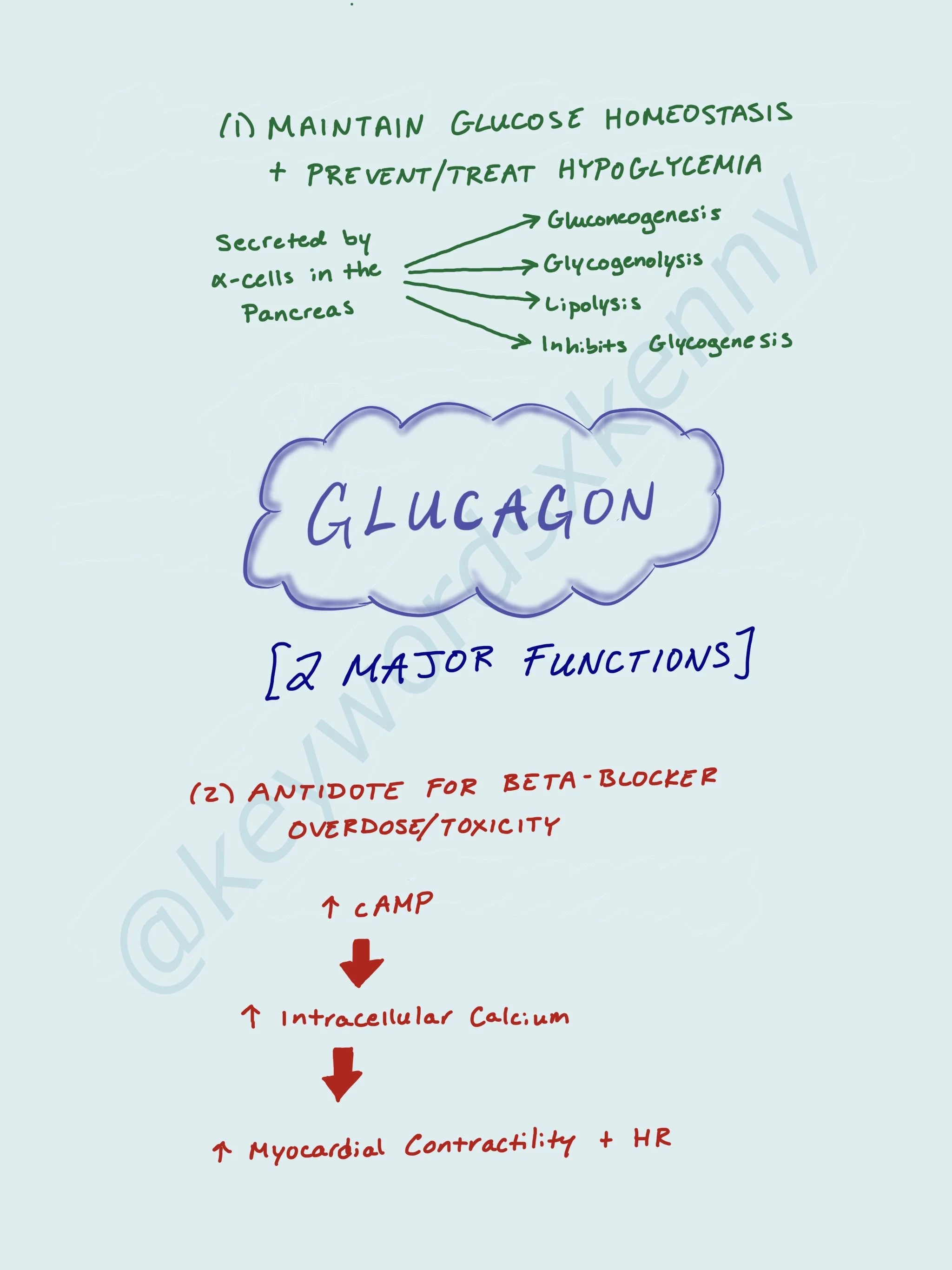 Glucagon is also available as a medication that can be used to treat hypoglycemia. But it also has an additional benefit that makes it a very useful antidote for a specific type of overdose/toxicity. Glucagon is the treatment of choice for beta-blocker toxicity. It increases levels of cyclic adenosine monophosphate (cAMP) which increases levels of intracellular calcium. An increase in Calcium leads to increased contractility and heart rate - both of which are decreased in response to beta-blockers.